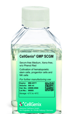 CellGenix® GMP Stem Cell Growth Medium is an optimized, xeno-free medium used for the serum-free expansion of low numbers of isolated human hematopoietic stem and progenitor cells (HSCs/CD34+ cells). In addition, CellGenix® GMP Stem Cell Growth Medium is proved to be highly efficient for the expansion and cultivation of human natural killer cells (NK cells) and human cytokine induced killer cells (CIK cells).