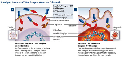 Incucyte® Caspase-3/7 Dyes for Apoptosis are formulated to detect apoptosis (cell death) in live cells. The dyes are ideally suited to the mix-and-read, real-time quantification of cells undergoing caspase-3/7 mediated apoptosis. Addition of the Incucyte® Caspase-3/7 Green, Red or Metabolism Dyes to healthy cells is non-perturbing to cell growth and morphology. When used with Incucyte® Live-Cell Analysis Systems and software, these reagents allow for reliable, accurate evaluation of cell death. Incucyte® Caspase-3/7 Dyes for Apoptosis couple the activated caspase-3/7 recognition motif (DEVD) to a DNA intercalating dye. When added to tissue culture medium, the inert, non-fluorescent substrate crosses the cell membrane where it is cleaved by activated caspase-3/7, resulting in the release of the DNA dye and fluorescent staining of the nuclear DNA. With Incucyte® integrated analysis software, fluorescent objects can be quantified and background fluorescence minimized. These reagents have been validated for use with the Incucyte® Live-Cell Analysis System and enable real-time evaluation of cell apoptosis induced by pharmacological agents and/or genetic and environmental factors.