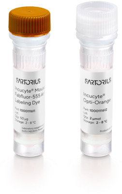 The Incucyte® Mouse IgG1 Fabfluor Antibody Labeling Dye is offered as a green reagent, Fabfluor-488 with an Opti-Green background suppressor, as red reagent, Fabfluor-594, or as an orange reagent, Fabfluor-555 with an Opti-Orange background suppressor.