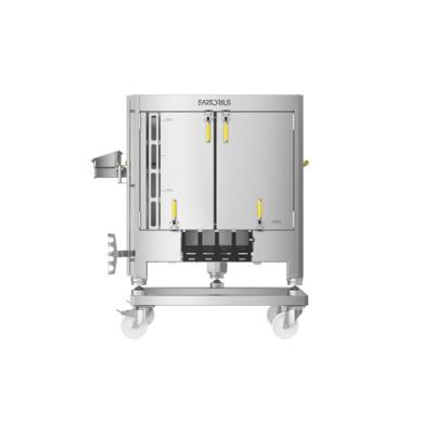 - The front doors allow easy installation of the mixing bag, and the front port gate facilitates installation of tubing lines and sensors, allowing for manipulations during filling, sampling, and draining.
