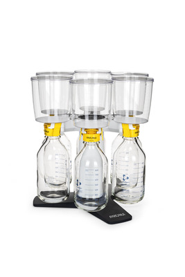 Sartolab® RF 1000 PES Vacuum Filtration Units can be used for stand-alone, single filtration tasks (utilizing the direct connection to a vacuum source). Alternatively, these units are also compatible with Sartorius’ Sartolab® Multistation. The Multistation is sophisticated yet simple and easy to use. For the Sartolab® RF 1000, the design of the yellow adapter connecting the funnel to the conical tube ensures a vacuum-tight seal and enables the filtration unit to be used on the Multistation for filtration of up to six samples in parallel with one vacuum source.