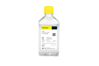 Take a bottle of TAE Electrophoresis Buffer (50X) from specified storage conditions at 15-30°C and read the label.